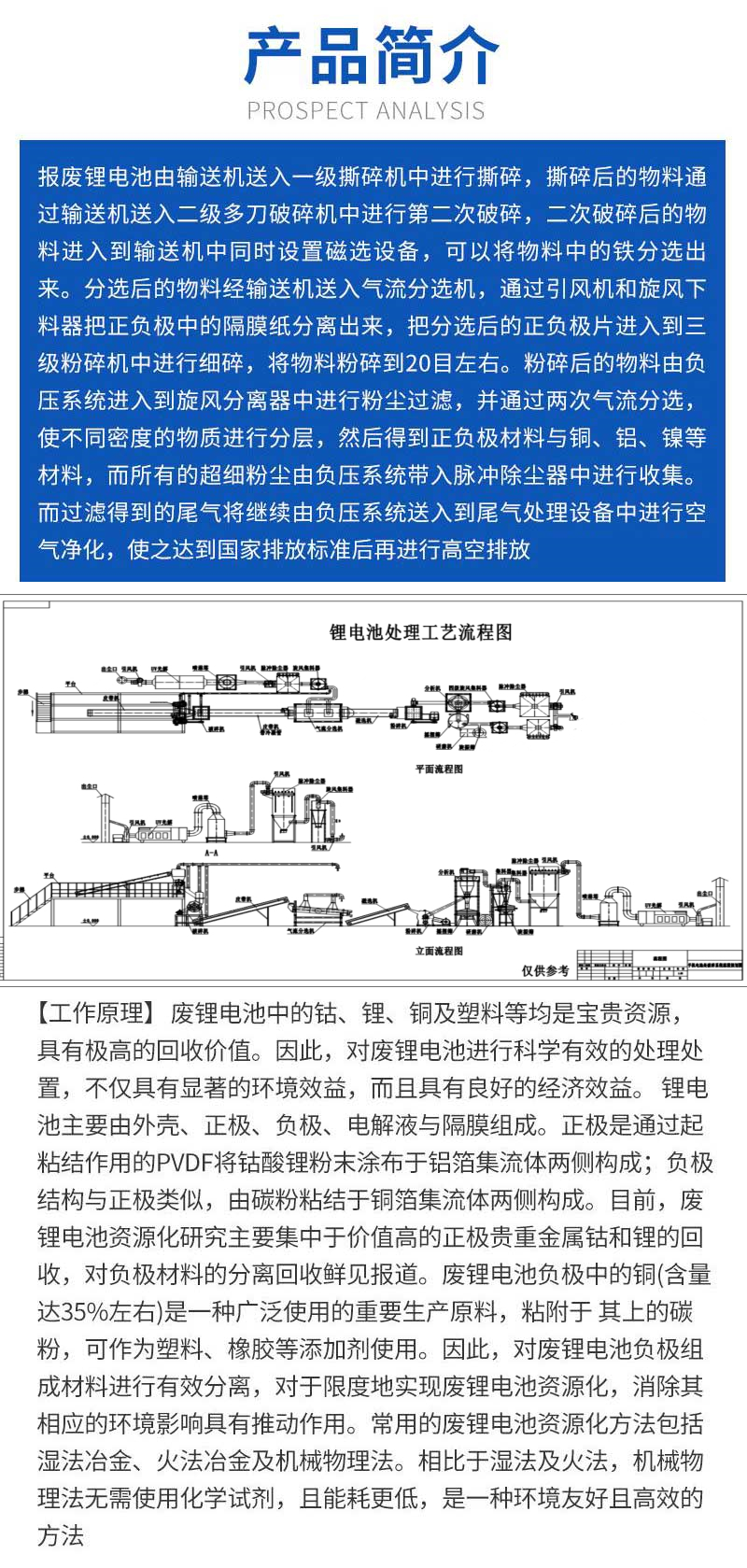 廢手機鋰電池回收處理設備主要采用物理回收方法,輔以“三廢”處置措施,具有綠色低碳、節(jié)能環(huán)保、無二次污染等特點,并兼顧經(jīng)濟與環(huán)保效益,既實現(xiàn)有價組分的利用,又可對有害組分無害化處理。整個回收過程全部實現(xiàn)了工業(yè)自動化,回收效率高,處理能力強,每小時處理量為500千克,年處理量達到5000噸,廢舊鋰電池有價組分回收利用率達90%以上。