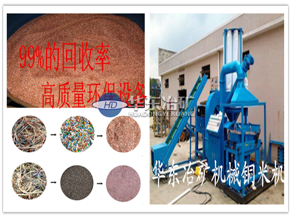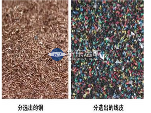 該型銅米機(jī)由粉碎機(jī)、輸送機(jī)、共振篩、離心風(fēng)機(jī)、除塵器幾部分組成。物料由進(jìn)料口進(jìn)入粉碎機(jī),粉碎后的物料由輸送機(jī)送到共振篩,在共振篩風(fēng)機(jī)的共同作用下銅和塑料分離開由兩端分別流出,灰塵雜質(zhì)由風(fēng)機(jī)送到除塵器中集中起來(lái)。